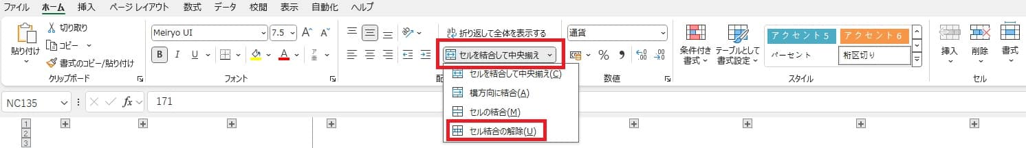 「セルを結合して中央揃え▼」をクリック→「セル結合の解除」をクリック。