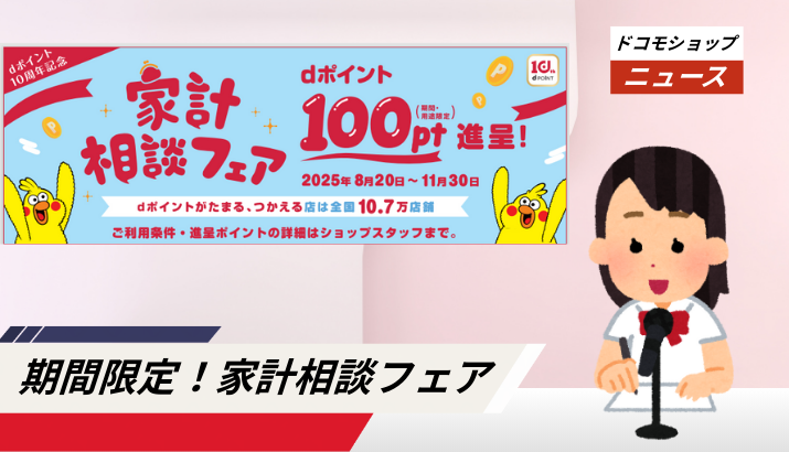 今ならドコモショップにご来店いただき、アンケート回答と家計相談をしていただくだけでdポイント(期間・用途限定)100ポイント進呈!